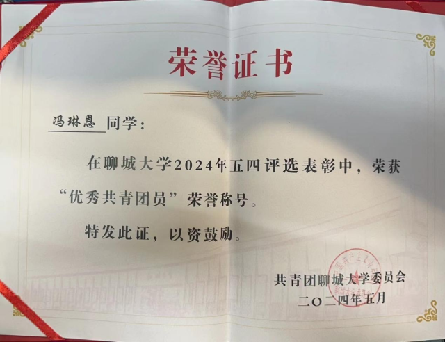 2024年,在ladbrokes立博五四评选表彰中荣获“优秀共青团员”荣誉称号。