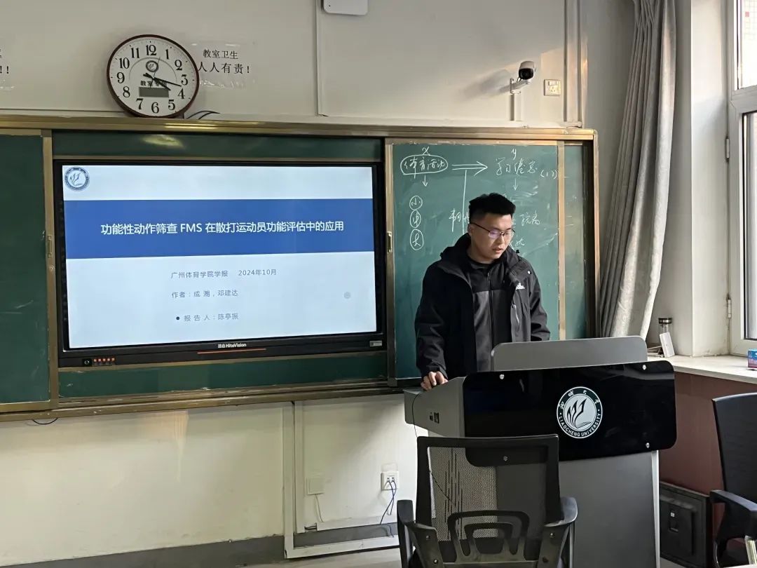 2024级体育教学专业研究生陈亭振汇报题目为《功能性动作筛查FMS在散打运动员功能评估中的应用》,本研究拟把FMS引入到散打项目,应用FMS对散打运动员进行功能评估,以此为基础对散打运动员动作功能进行诊断,为科学训练提供参考。