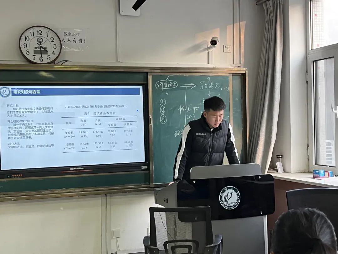 2024级体育教学专业研究生许振邦汇报题目为《功能性与传统力量训练的训练效果比较研究——基于下肢运动生物力学、FMS和运动能力测试》,本研究以下肢运动生物力学指标、功能性动作质量以及运动能力为切入点,对功能性和传统力量训练两种训练手段的实践应用效果进行进一步研究,以期在此基础上进一步揭示两者训练的相互关系。