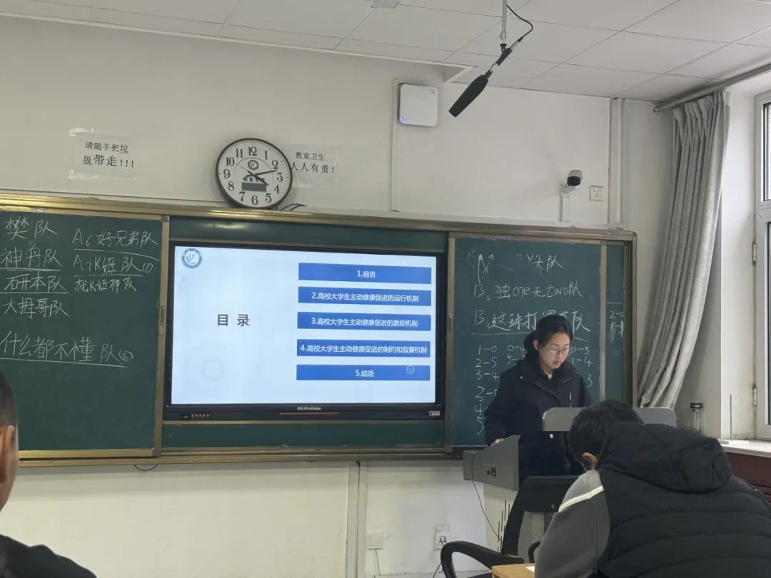 2024级体育教育训练学专业研究生马晓晴汇报题目为《健康中国视域下高校老员工主动健康促进的管理机制构建》本研究基于“健康中国”战略规划,从分析高校老员工体质健康状况和现实诉求入手,构建运行机制、激励机制、制约和监督机制三大主动健康促进管理机制,旨在积极推动高校老员工健康管理工作机制创新,为实现“健康中国”提供坚实的制度保障。