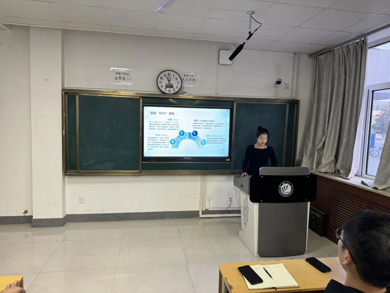 本次活动由运动人体科学专业的安晓丽作为分享人,倾囊相授。开场便点明踝关节在各类运动中的关键作用与损伤风险,瞬间抓住了听众的心。在紧急处理环节,她结合实例,细致讲解损伤后的正确操作,从RICE原则的精准运用,到现场示范简易固定技巧,让复杂理论直观易懂。谈及康复阶段,安晓丽从康复训练的分期规划,到各阶段针对性的力量、平衡、灵活性练习要点逐一拆解,还分享了利用弹力带、平衡球等小工具在家高效康复的窍门,实操性满满。