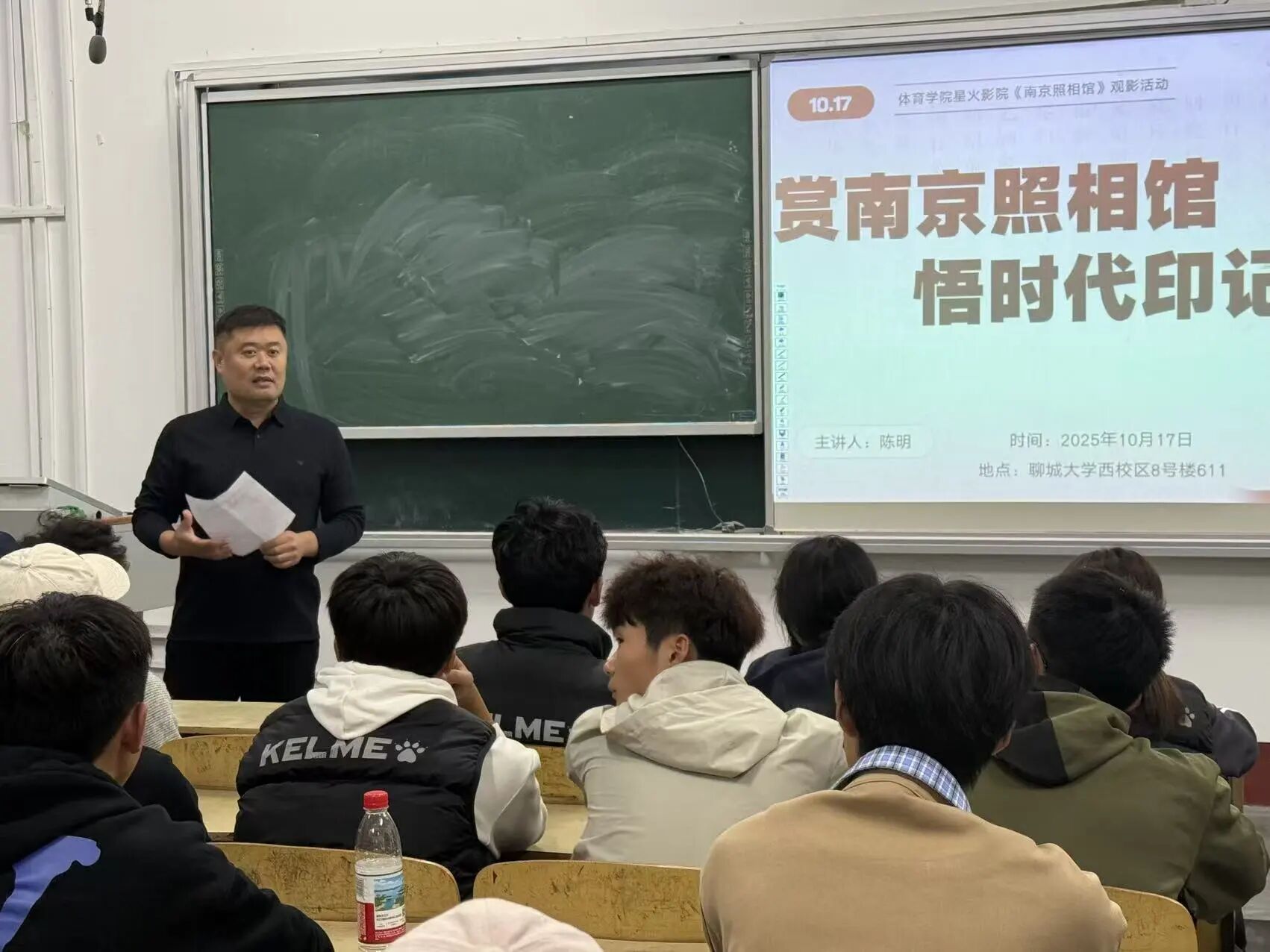 活动伊始,团委书记陈明作为主讲人详细阐述了本次活动的初衷,他指出《南京照相馆》,不只是普通的影像展现,更是一堂深刻的爱国教育课。影片以一家照相馆的兴衰为线索,带我们重回那个风雨如磐的年代,让我们透过镜头真切见证民族曾历经的苦难,以及在苦难中彰显的坚韧品格;他号召同学们在观影时用心感受历史的厚重温度,从先辈的抗争与坚守中汲取砥砺前行的精神力量。随后,灯光熄灭,电影正式放映。