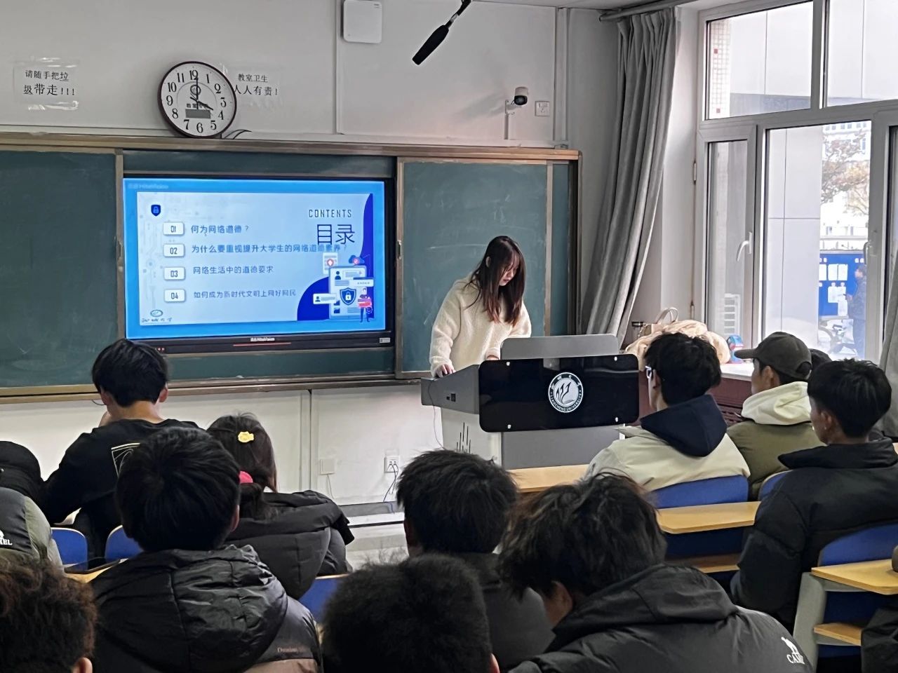 张雅琪带领同学们分析如今的网络生态环境讲解网络法律素养,借助一些因不当网络舆论导致违法的真实案例,以案释法、以思导行,向同学们传达文明上网时的“四不四要”原则,使同学们深刻认识网络行为规范的重要性,树立正确的网络价值观,以实际行动来构建文明健康的网络环境。