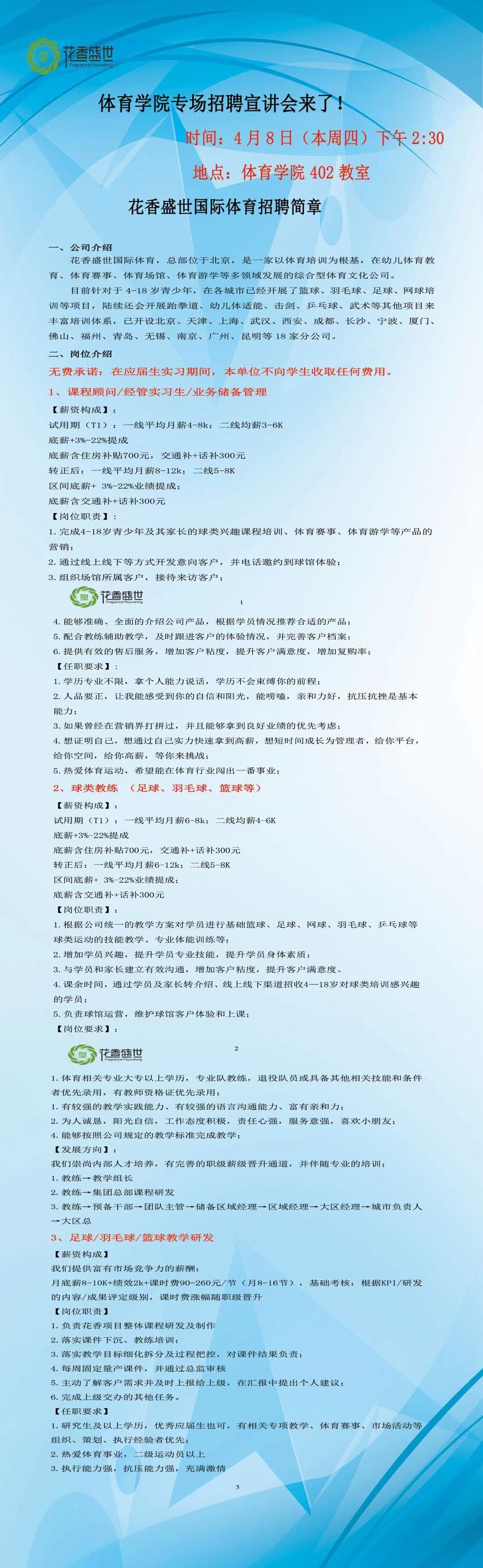ladbrokes立博高度重视毕业生就业工作,为拓宽毕业生就业渠道,增加就业机会。4月8日下午,ladbrokes立博邀请了花香盛世国际体育公司召开招聘宣讲会,此次招聘会得到公司领导的大力支持和帮助,17级部分毕业生参加会议。